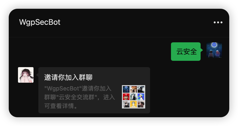 添加 WgpSecBot 微信可以加入云安全交流群,搜索微信号WgpSecBot 或扫描以下二维码可以添加它,添加后发送云安全就可以进群了。