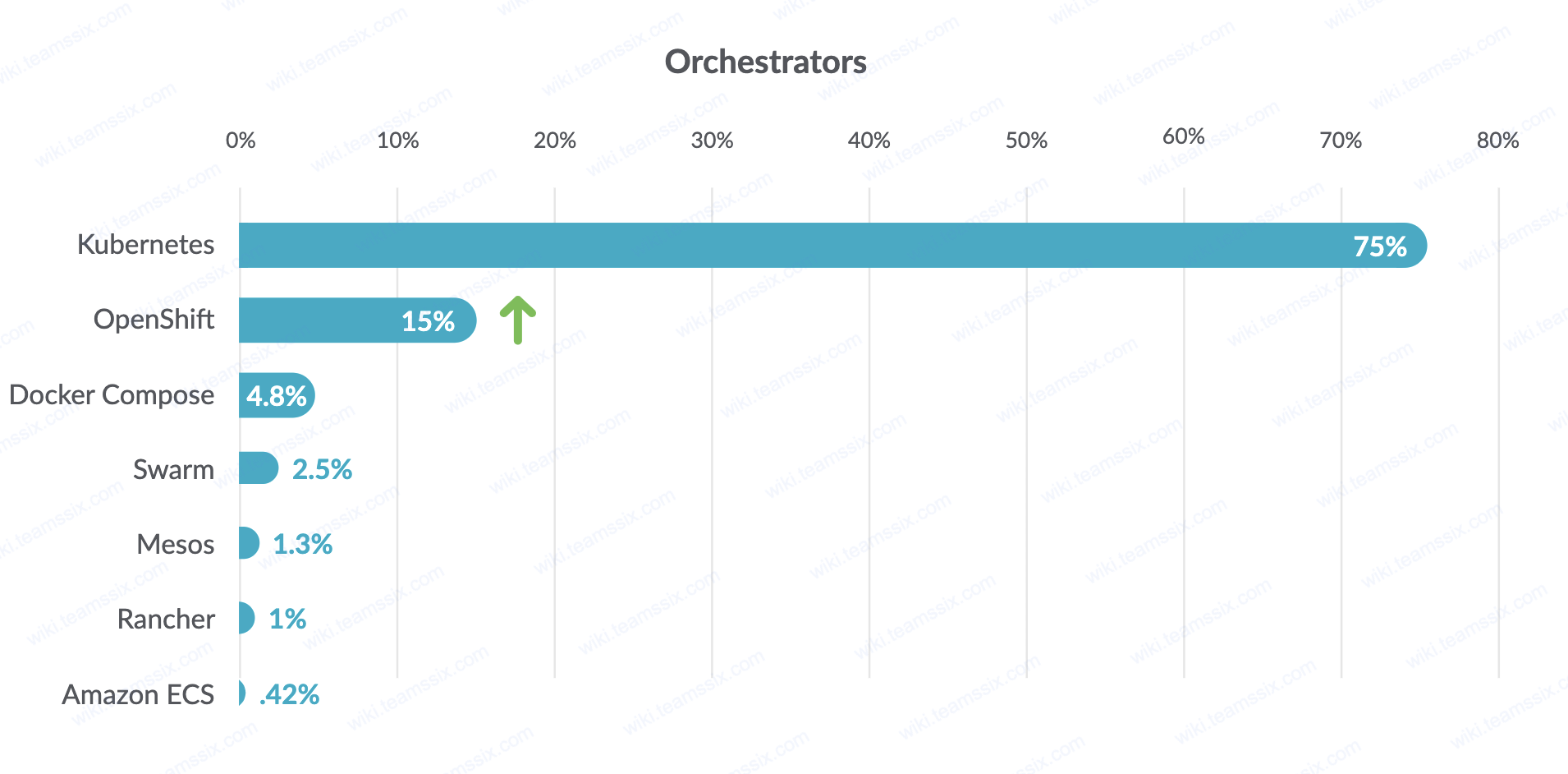 以下是 Sysdig 在 2021 年给出的容器编排工具流行度图表,可以看到 Kubernetes 可谓是一骑绝尘。