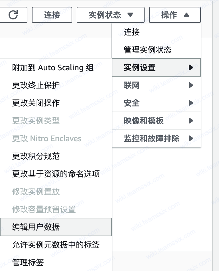 修改用户数据的位置在:操作-> 实例设置->编辑用户数据