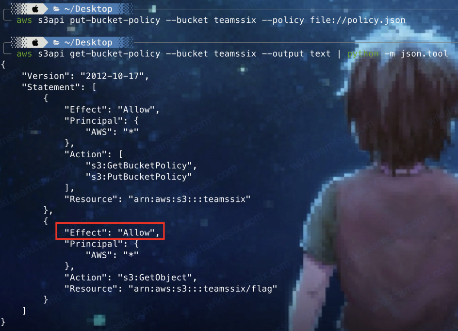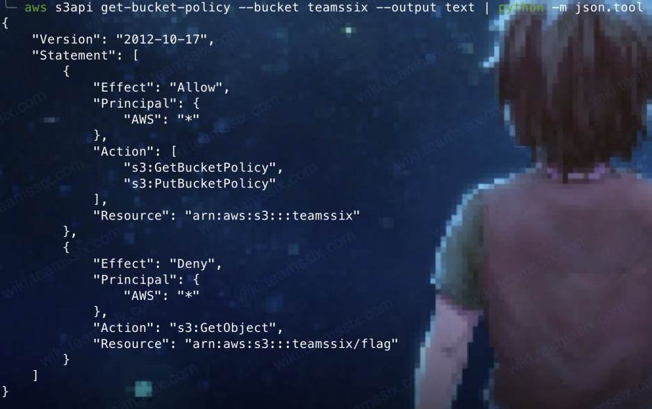 可以看到根据当前配置,我们可以对 Bucket 策略进行读写,但如果想读取 s3://teamssix/flag 是被禁止的